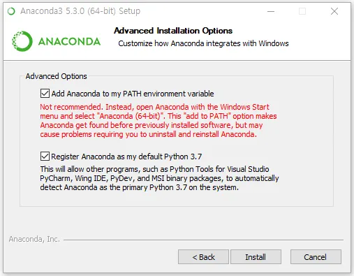 아나콘다 측 설명을 보면 "PATH 환경 변수에 Anaconda를 추가할지 여부를 선택하십시오. PATH 환경 변수 에 다른 소프트웨어를 방해 할 수 있으므로 Anaconda 를 추가하지 않는 것이 좋습니다 . 대신 시작 메뉴에서 Anaconda Navigator 또는 Anaconda Prompt를 열어 Anaconda 소프트웨어를 사용하십시오."