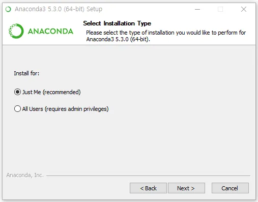 All Users를 선택할 경우 Just ME와 설치되는 경로가 다르며 패키지를 설치 또는 삭제 업그레이드 시 CMD창을 관리자 권한으로 열어 실행해야 하는 경우가 있습니다.