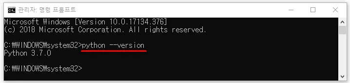 마지막으로 윈도우에서 CMD창을 열어 설치가 잘되었는지 확인